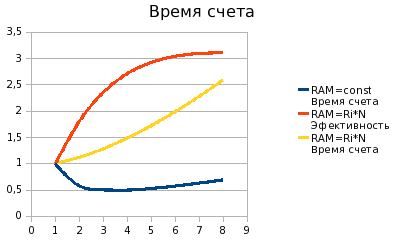 неограниченной памятью) ко времени счета такой же сетки на кластере. Желтый график показывает рост времени счета