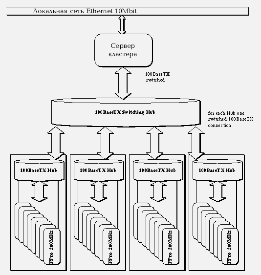 Как уже говорилось, узлы кластера можно связать обычным способом, используя Ethernet-адаптеры. Соединение машин кластера может выглядеть так, как это показано на рисунке.